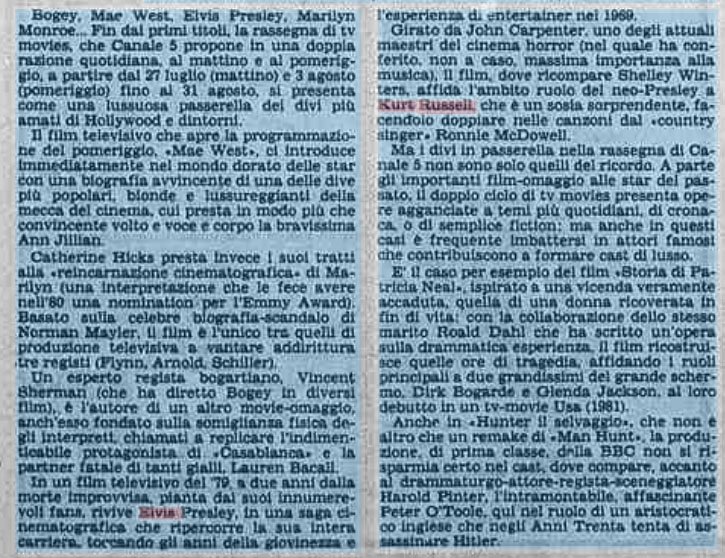 Ritaglio di giornale dell'uscita cinematografica di Elvis il re del rock, di John Carpenter con Kurt Russell